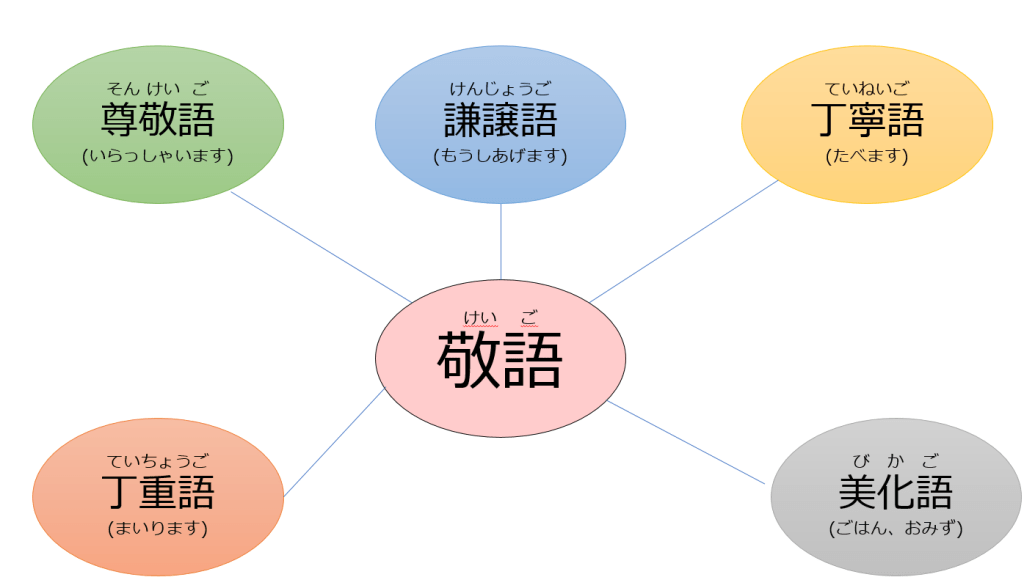 | 尊敬語 | 謙譲語 | 丁重語 | 丁寧語 | 美化語 |