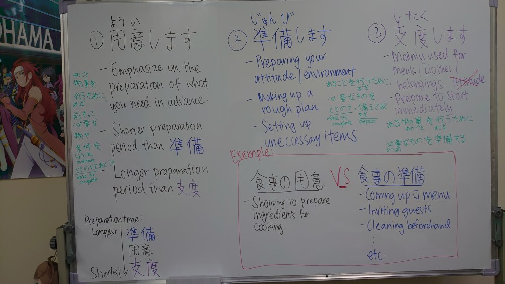 Yesterday in our Beginner class, we had a good discussion on the differences between 用意します/準備します and 支度します。 Hope to share this with you guys out there.