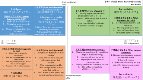 Diana Baumrind (臨床発達心理士 (Clinical/Development Psychology)はこう提唱しました。子育ての方法は3つに分けれて、そのあと、Maccoby and MartinはBaumrindの3つのタイプに、4つ目のタイプである放任型を加えた。